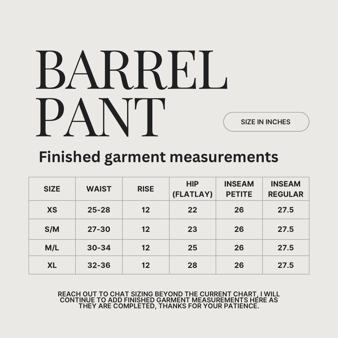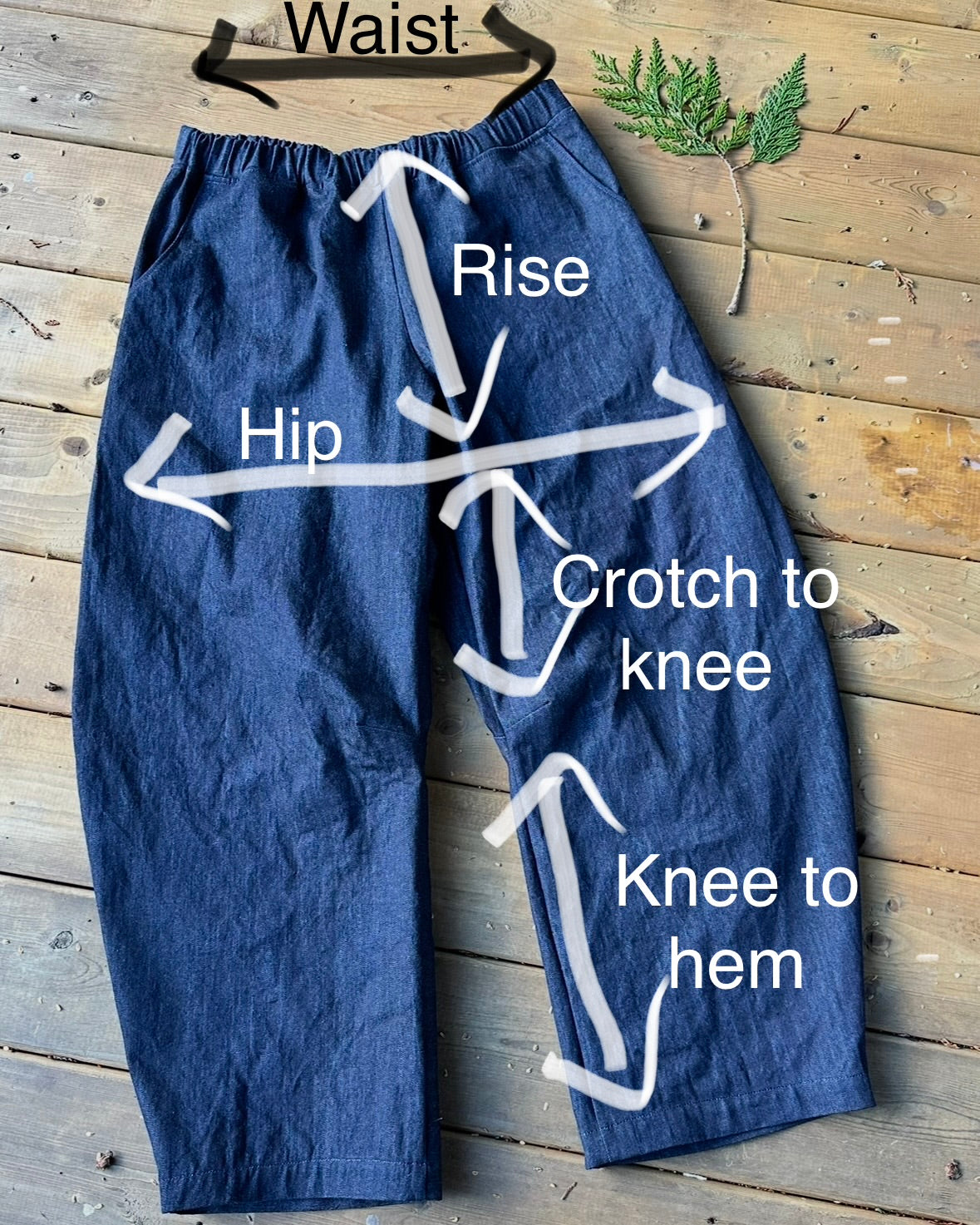 Refer to photo to assist in comparing these measurements to a similar pair of elastic waist slip on pants you own in a rigid fabric.(The crotch to knee measurement is of particular importance to ensure the barrel shape hits ideal.) Reach out with questions on sizing prior to ordering, very happy to assist, sales are final.