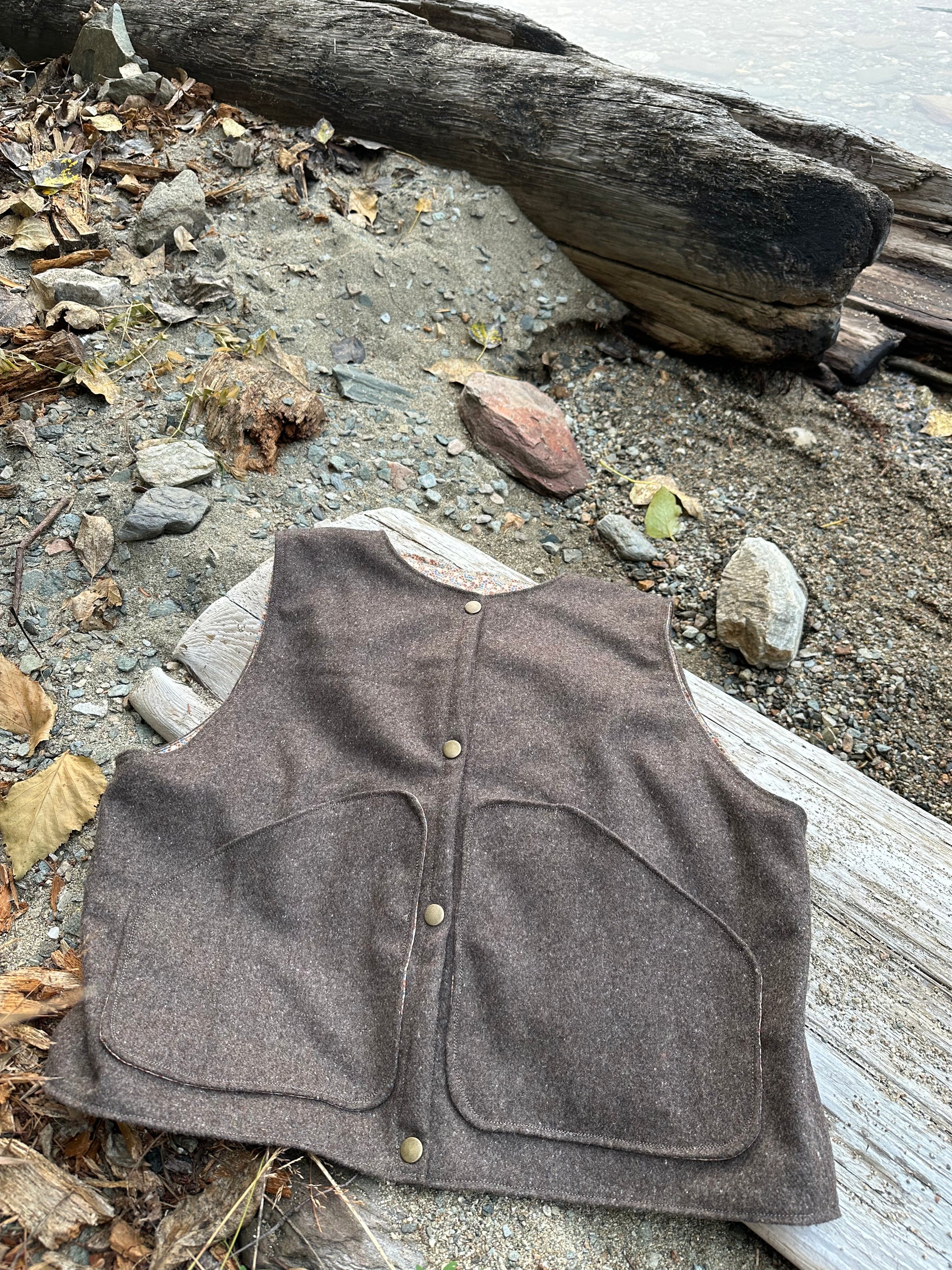 Lightweight vest built for layering. Wool outer and ditsy floral cotton lining.