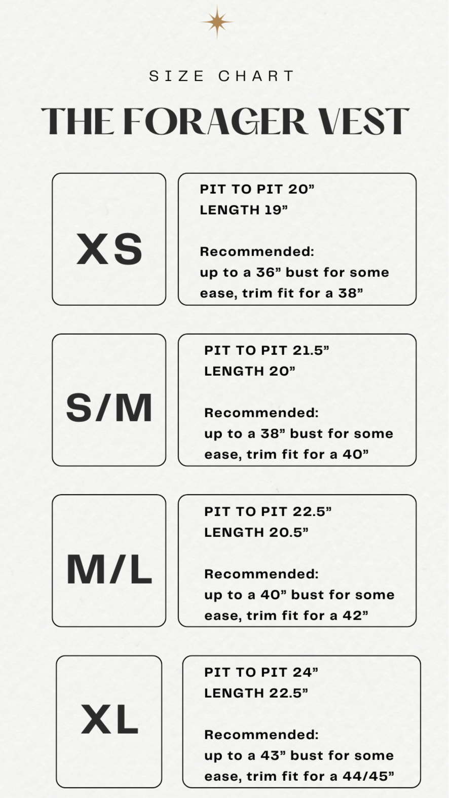 Refer to size chart in photos. I am wearing a S/M and am a 38” bust. Final sale, please reach out with questions, always happy to help.