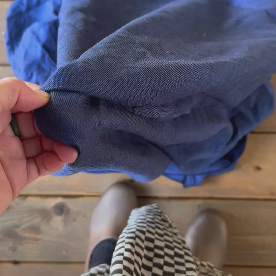 Crafted from deadstock 50% linen 50% cotton mid blue toned textile 210 gsm midweight fabric.