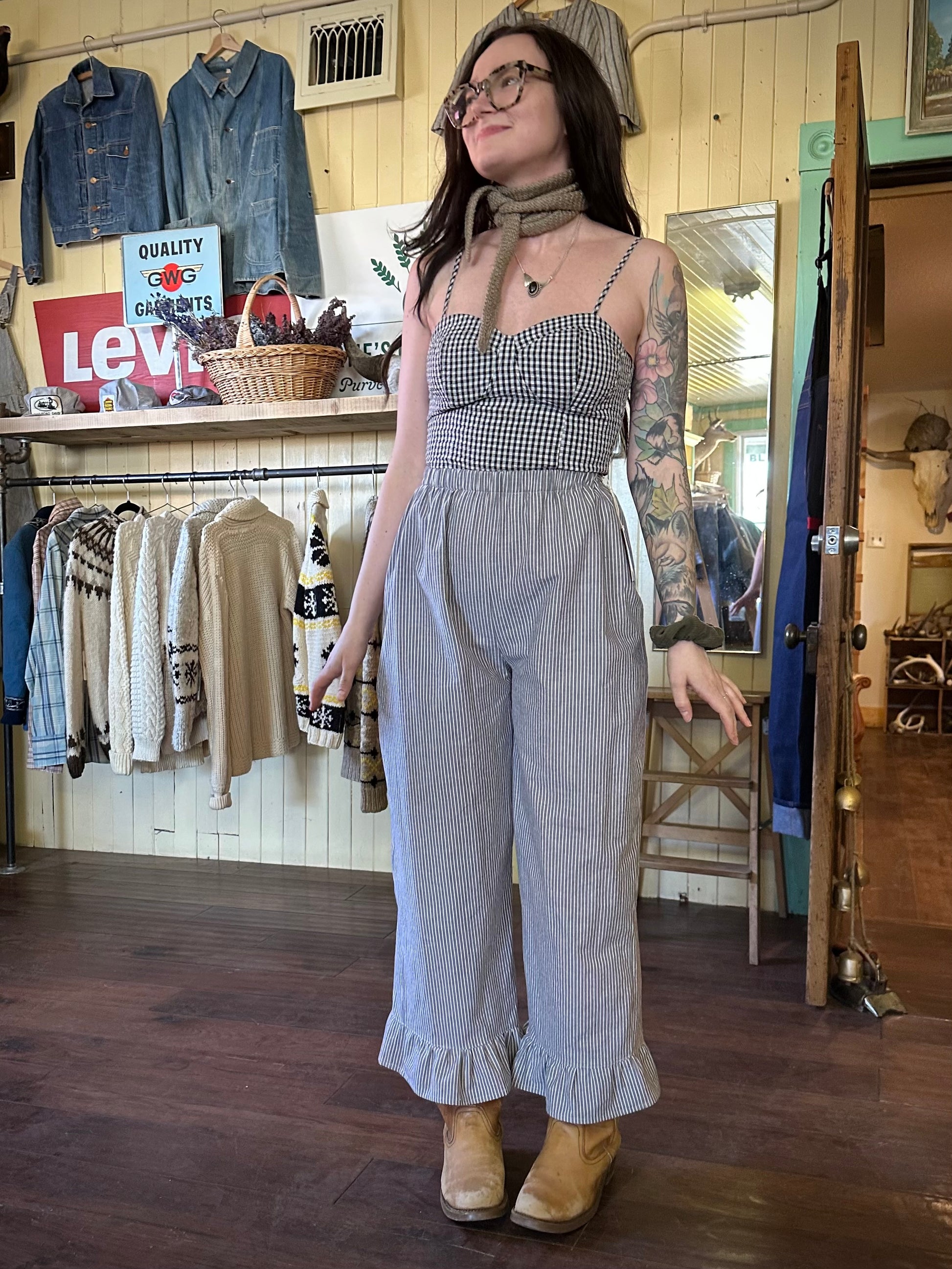 This season’s ruffle pants will have a drawstring and side inseam pockets. 3/4” elastic waistband for comfy lounging. If you’d prefer no pockets or drawstring reach out and I can create a listing at a lower price point for you. If your size if not listed please message me to chat about your measurements.