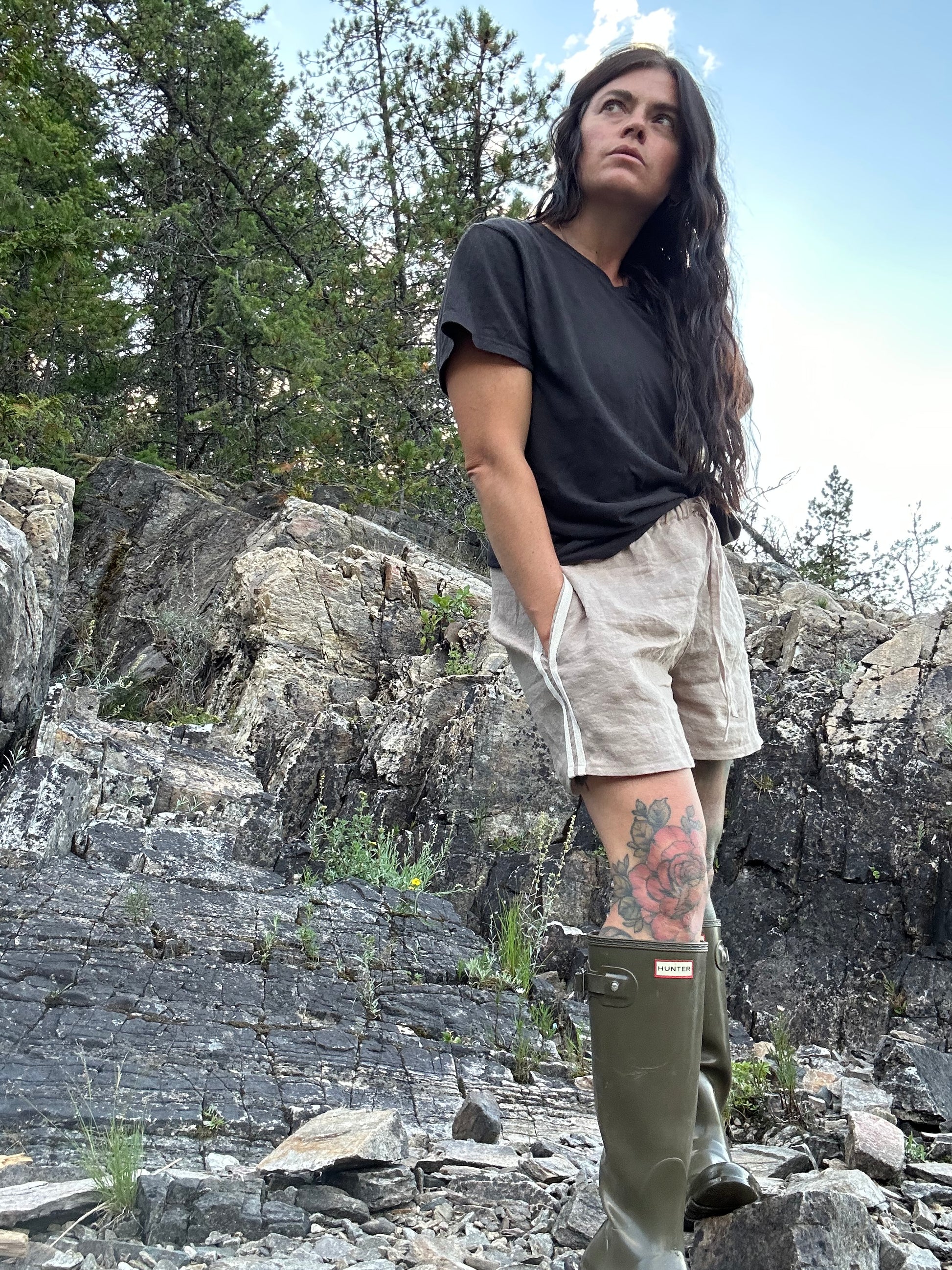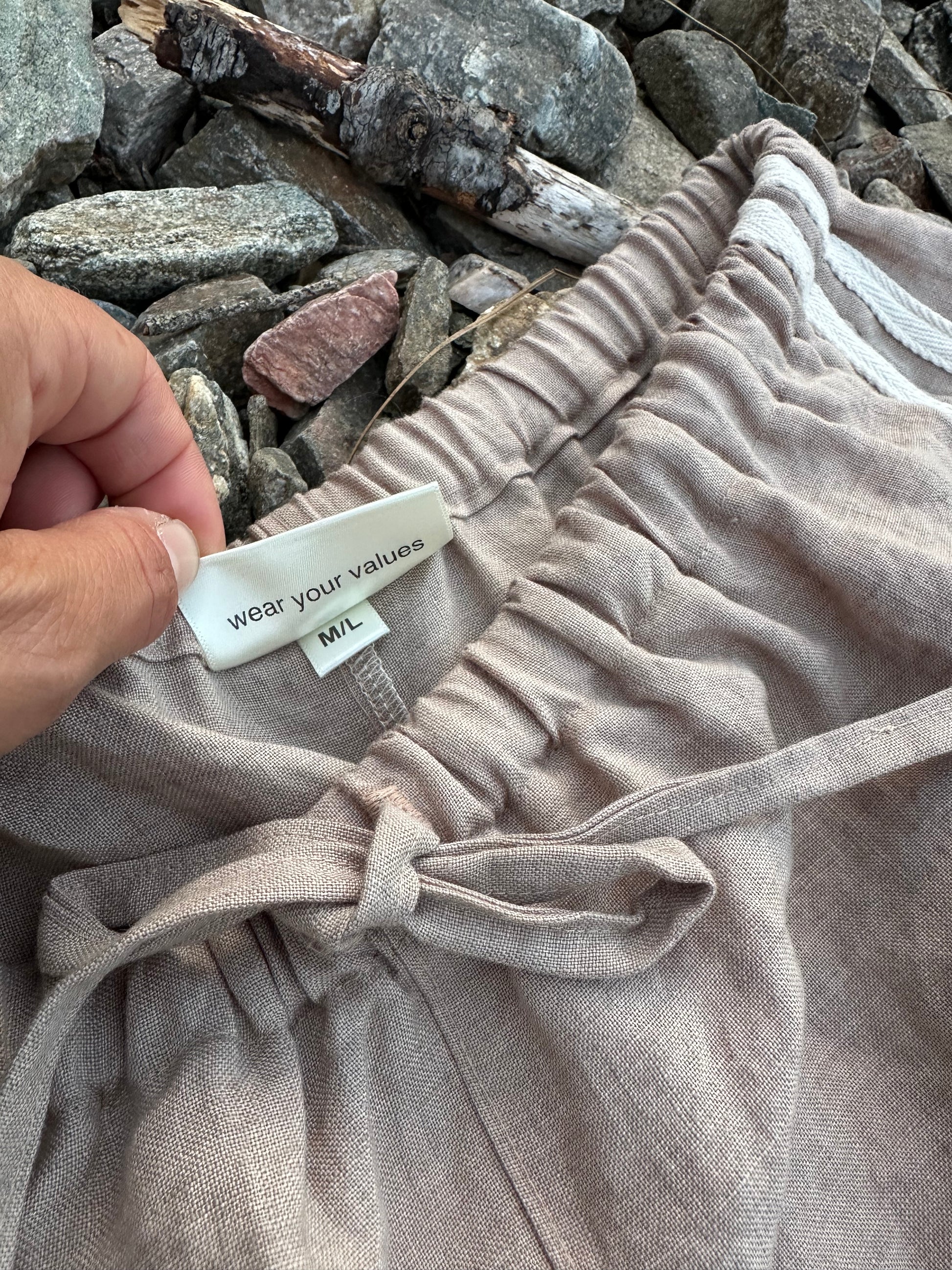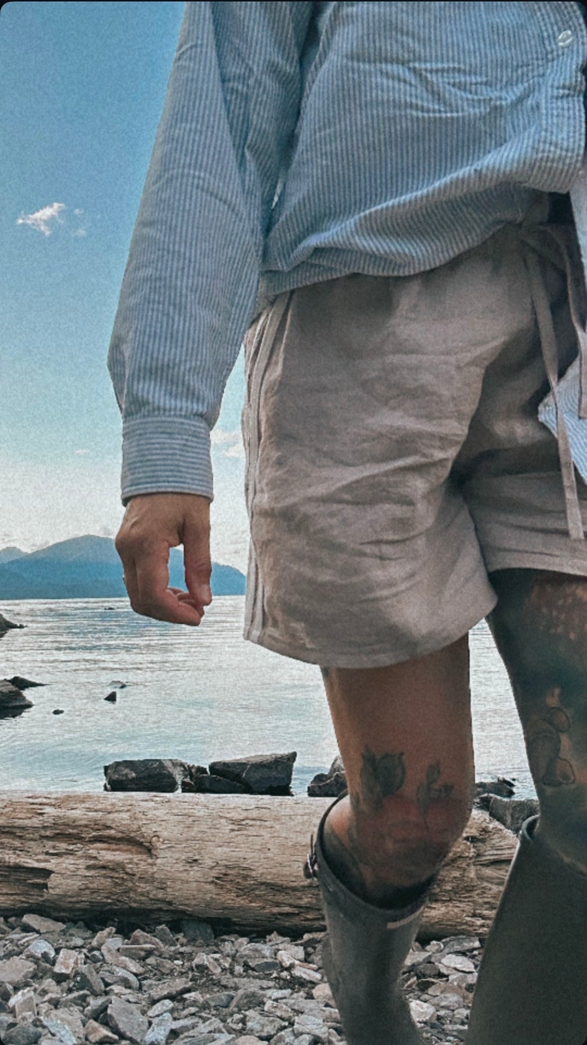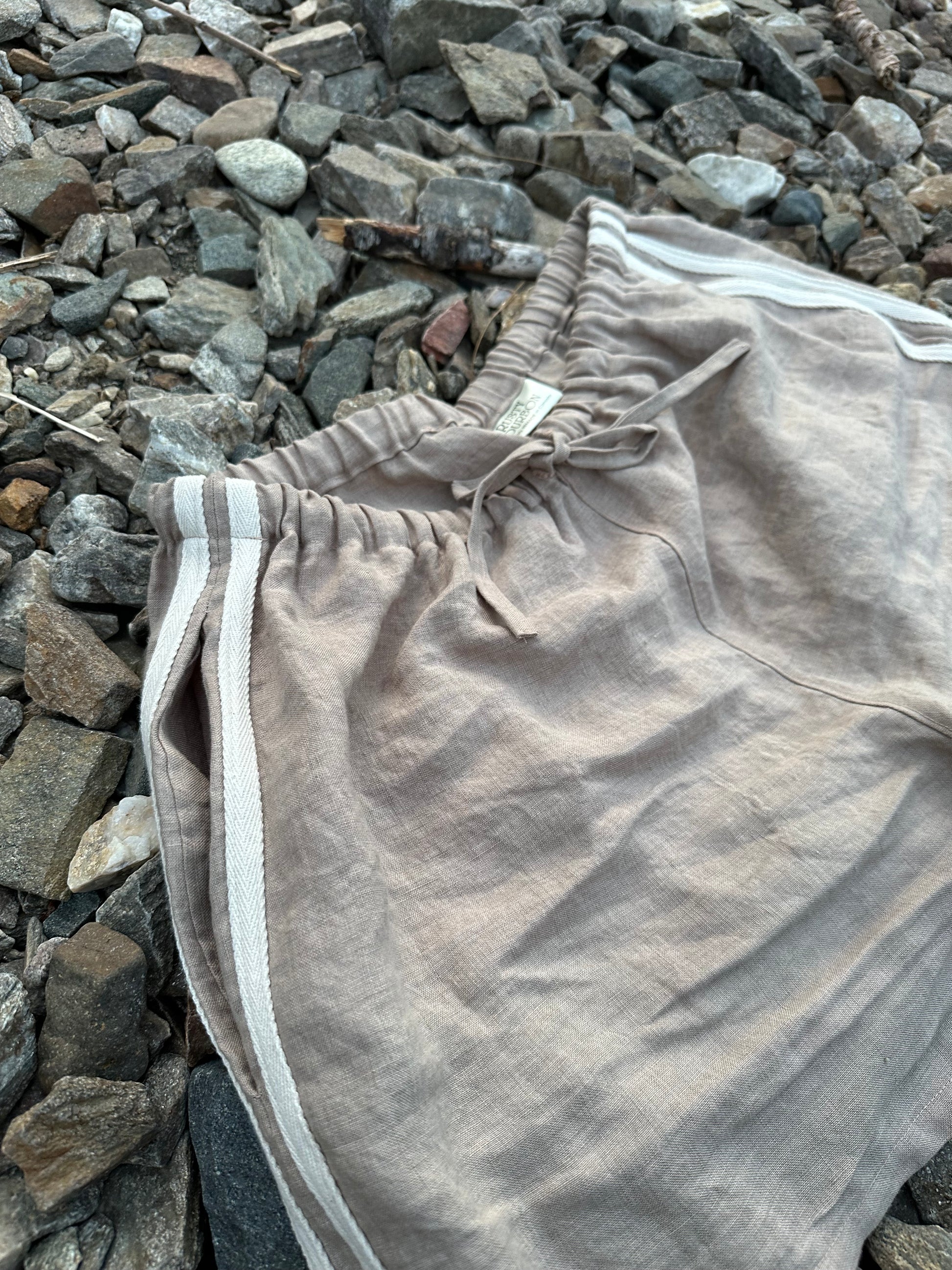 Side seam pockets, elastic waistband and a drawstring in these classic sporty linen shorts. 3.5” inseam