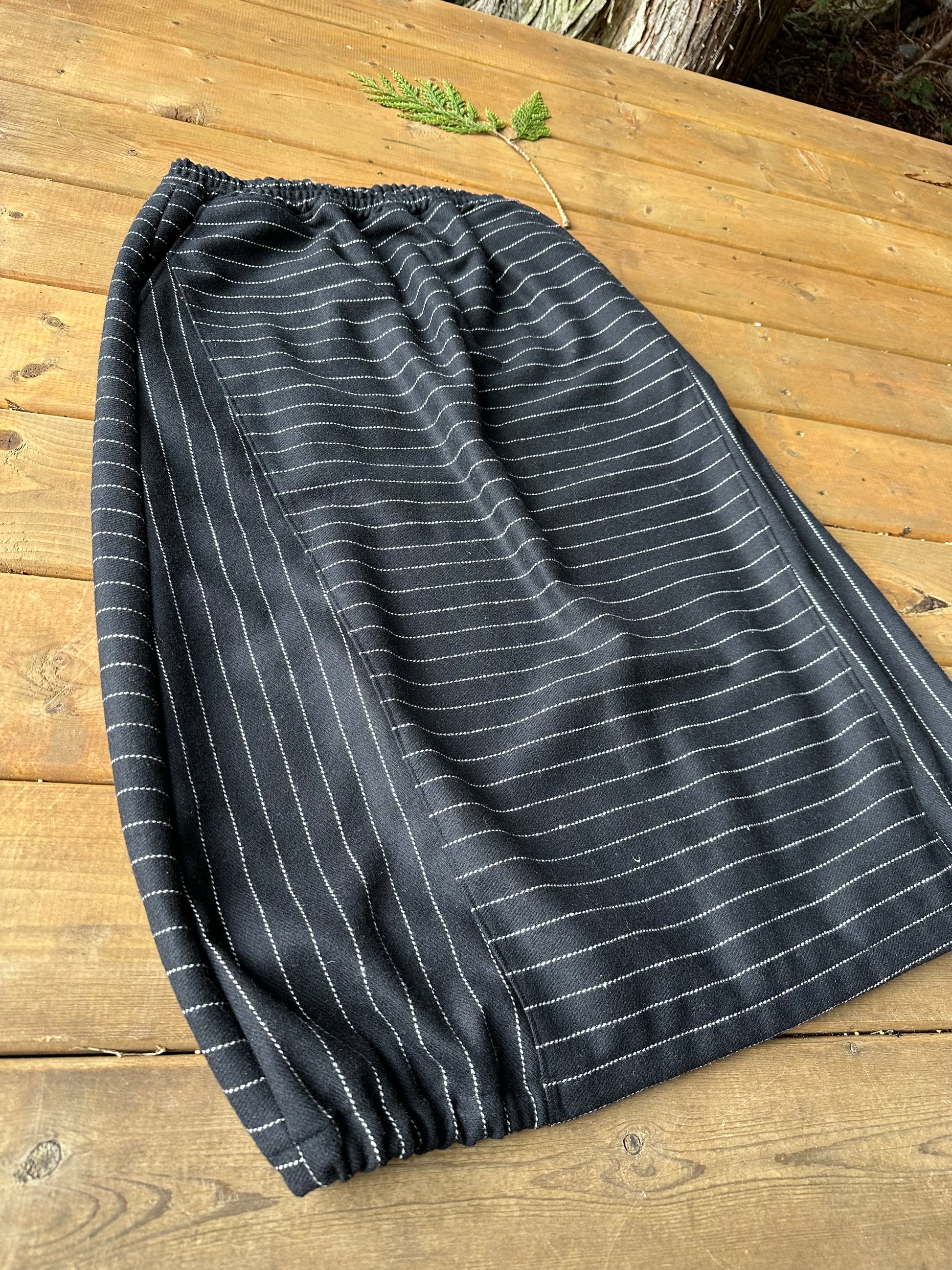 This is a very good non summer skirt option. Front pockets, elastic waist. Alternating stripes in side inserts. Gathered elastic bottom hem, still comfortable for walking. Denim version shown happily on my beach walks.